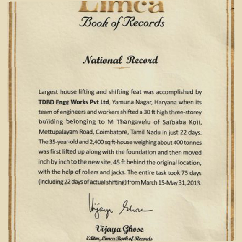 Largest House Lifting and Shifting feat was accomplished by TDBD Engg. Works Pvt. Ltd